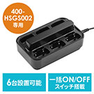 ワイヤレスガイドシステム(400-HSGS002)用の専用クレードル充電器。ケーブル接続不要、セットするだけで充電できる充電ステーション。最大6台までまとめて充電できる充電台。一括集中スイッチ搭載で、まとめて充電スタートとストップができる。【WEB限定商品】