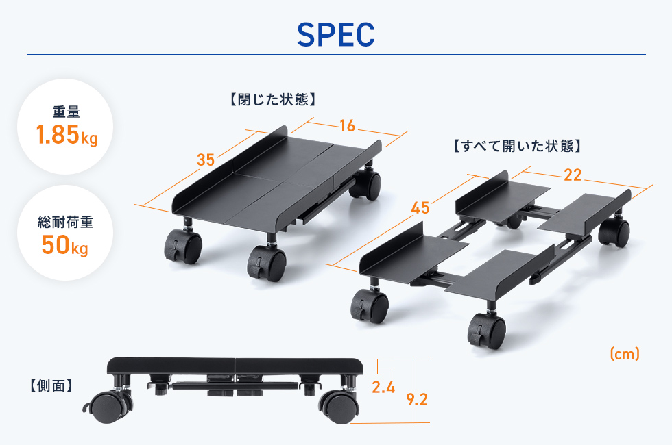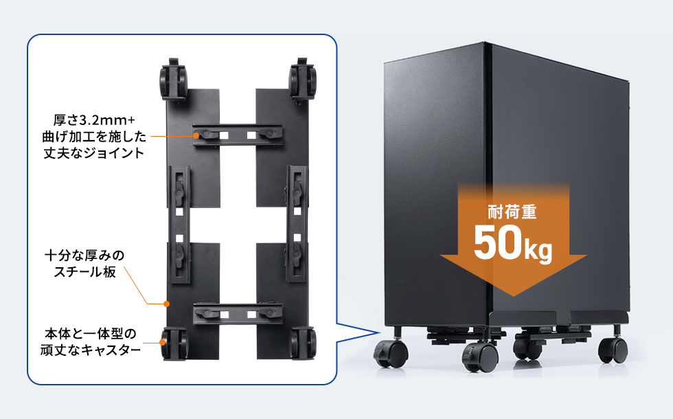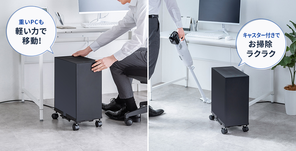 CP-055は、ミニタワー・ミドルタワーパソコンの設置を想定したCPUスタンドです。床置きやデスク下で場所を取りがちなデスクトップパソコンをすっきり設置でき、家庭用からオフィス用まで幅広く対応します。パソコン本体の定位置を作れるため、作業スペースを整理しやすくなります。