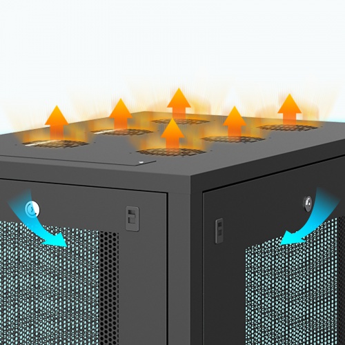 ●上面には、天井からの引き込み線や天井設置機器のケーブルを、サーバーラック内部に引き込めるケーブル口付きです。
