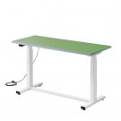 帯電防止、耐薬品性があるグリーンの塩ビシートを張った電動昇降作業台。耐荷重100kgで物流での梱包処理や工場でのメンテナンス作業に最適な上下昇降デスク。コントローラーで簡単に任意の高さに調整できる電動昇降デスク。幅120cm、奥行50cm。