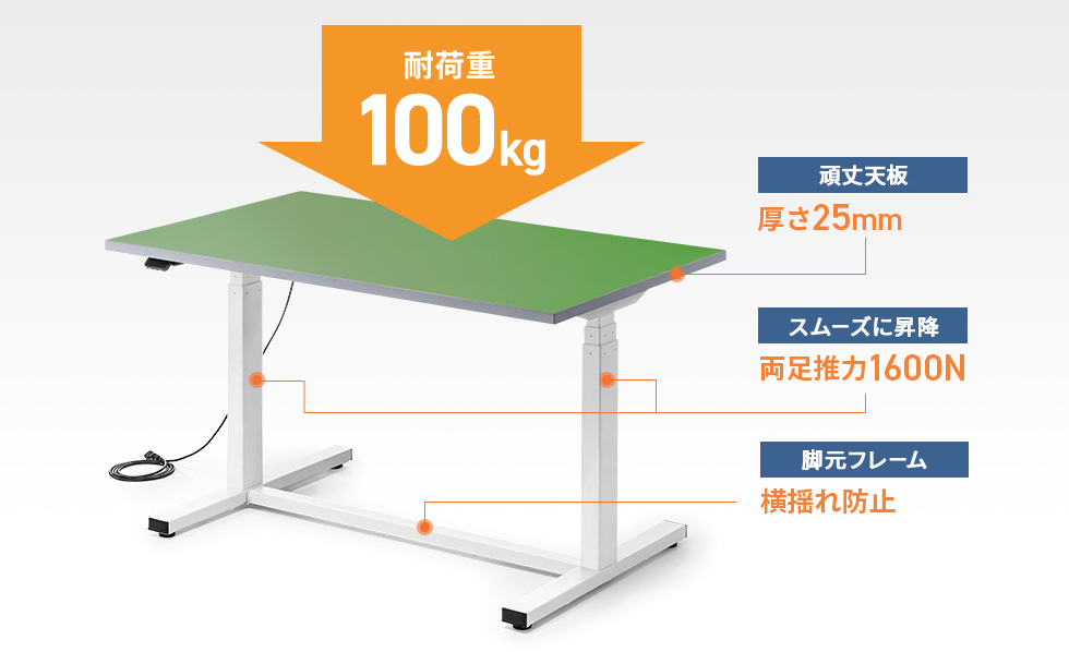帯電防止、耐薬品性があるグリーンの塩ビシートを張った電動昇降作業台。耐荷重100kgで物流での梱包処理や工場でのメンテナンス作業に最適な上下昇降デスク。コントローラーで簡単に任意の高さに調整できる電動昇降デスク。幅120cm、奥行75cm。