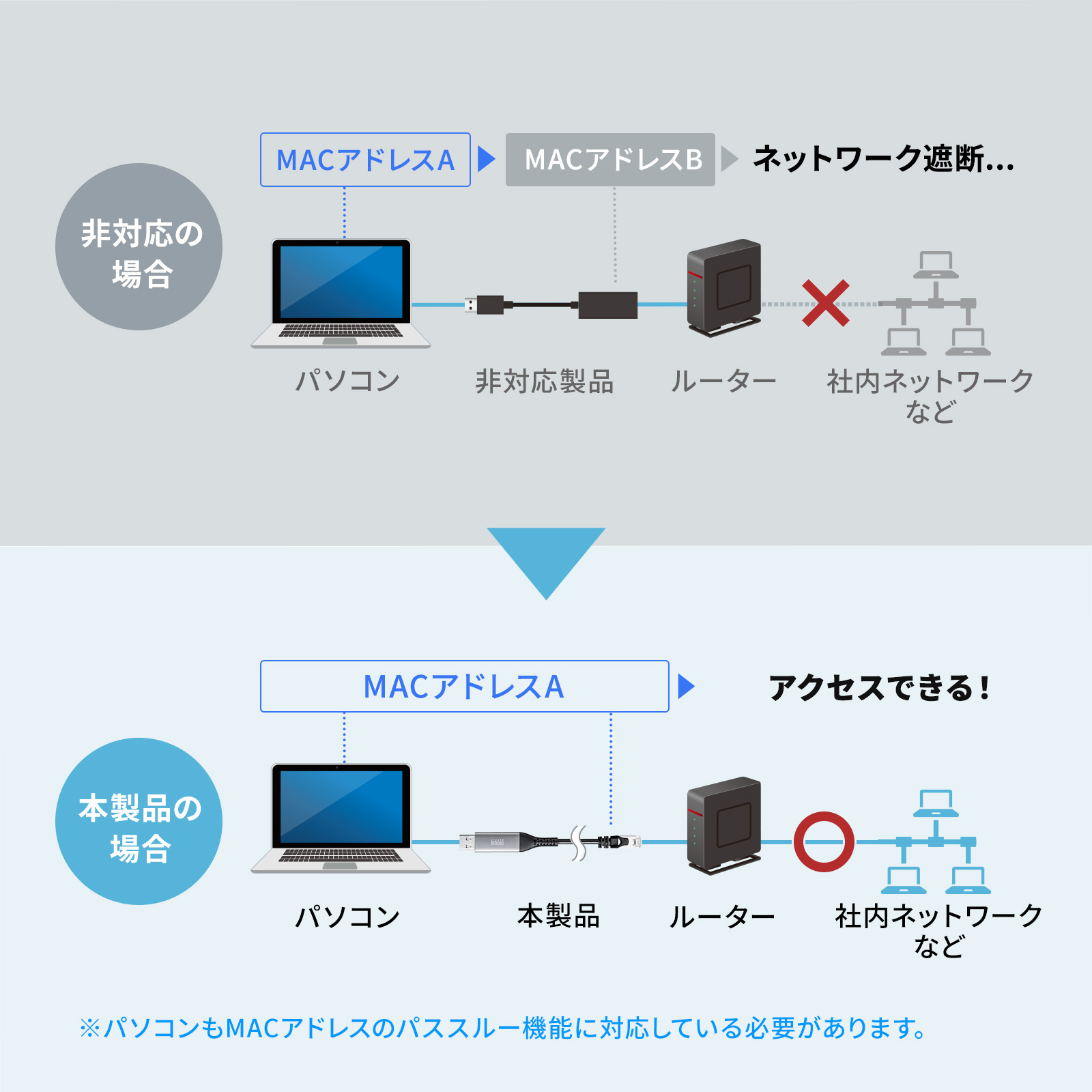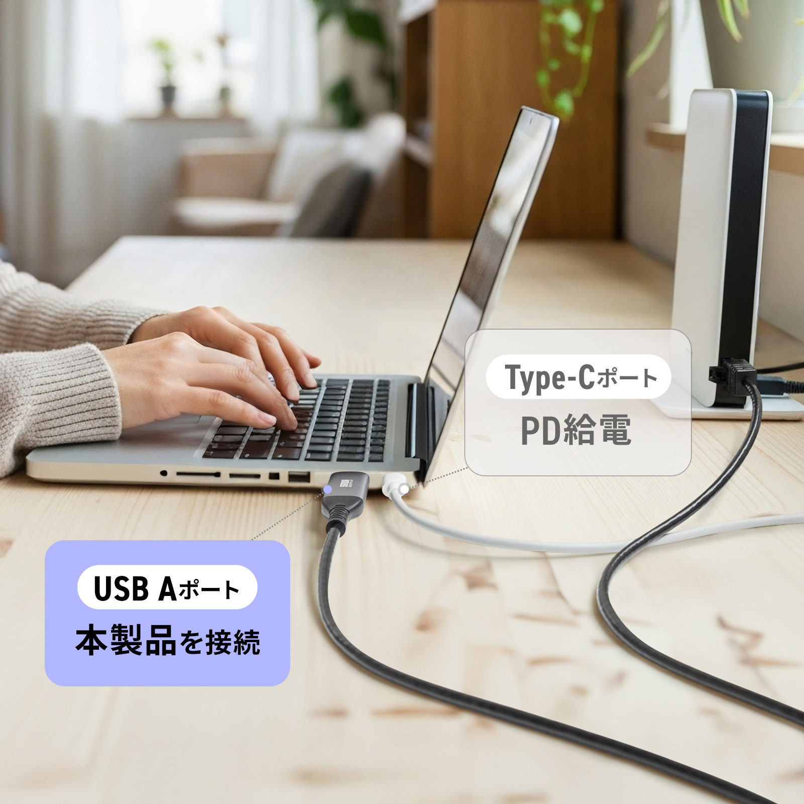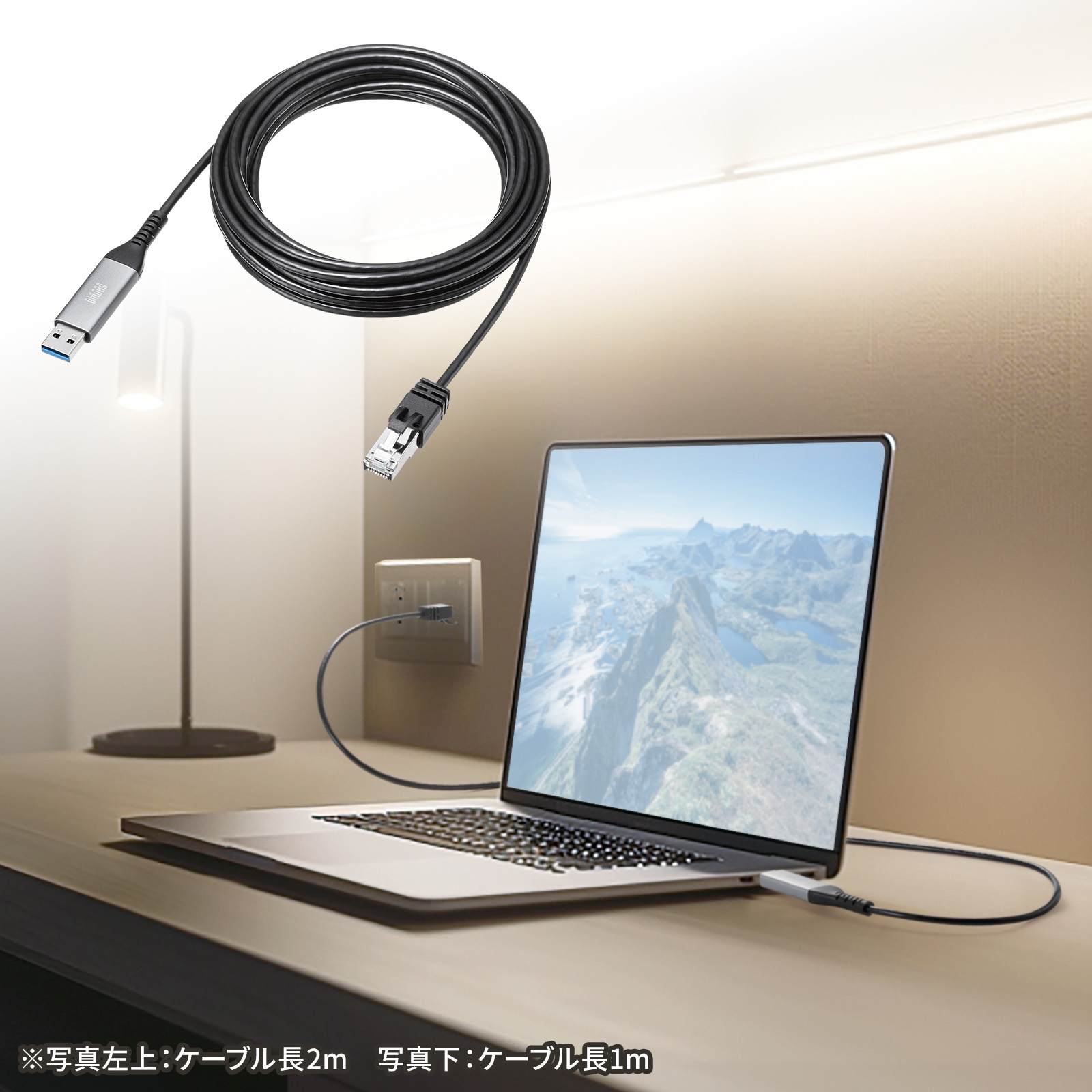 USB AをLANポートに変換できるCat6対応LANケーブル。ドライバ不要で接続するだけで使用可能。WEB会議やゲームなど高速かつ安定したネットワーク環境を実現。MACアドレスパススルー機能に対応。1m。