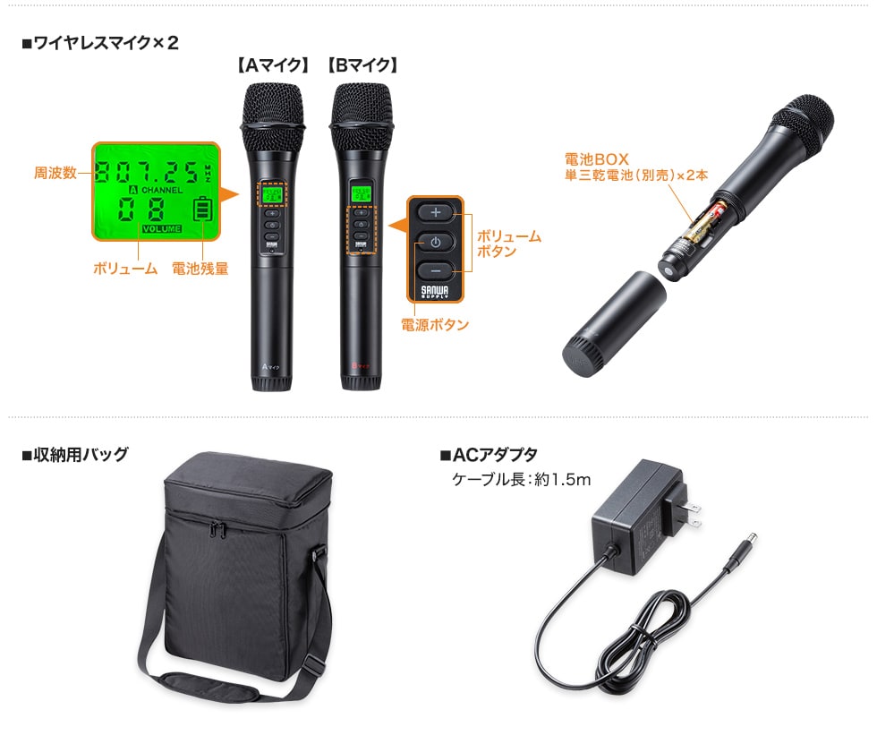 ●ワイヤレスマイク2本を同梱しており自由に移動しながらの同時使用が可能です。別売りの有線マイクを追加することで最大4本のマイクを同時利用することが可能です。