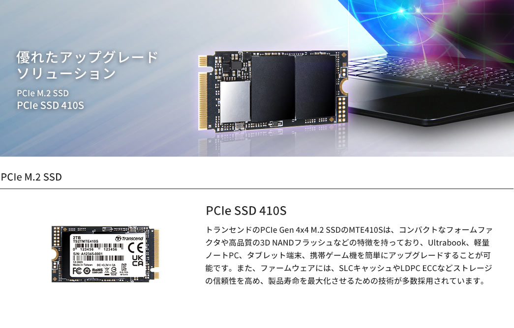●MTE410SはType2242サイズの小型M.2 SSDで、ノートPC、タブレット端末などに最適です。
