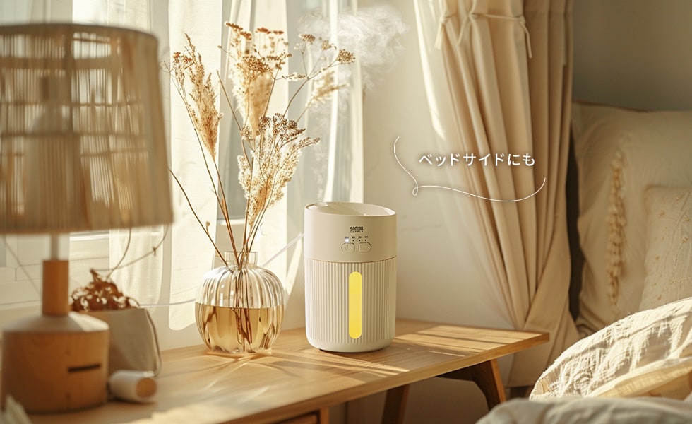 開けずに上から簡単に給水できるUSB卓上加湿器。倒れても水が漏れない構造。簡単操作。オフィスでも自宅でも馴染むシンプルなデザイン。触れても熱くない超音波式。ホワイト。