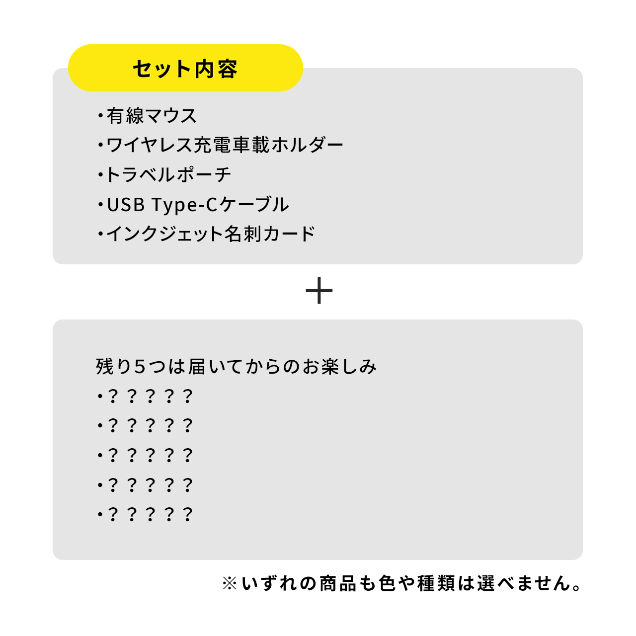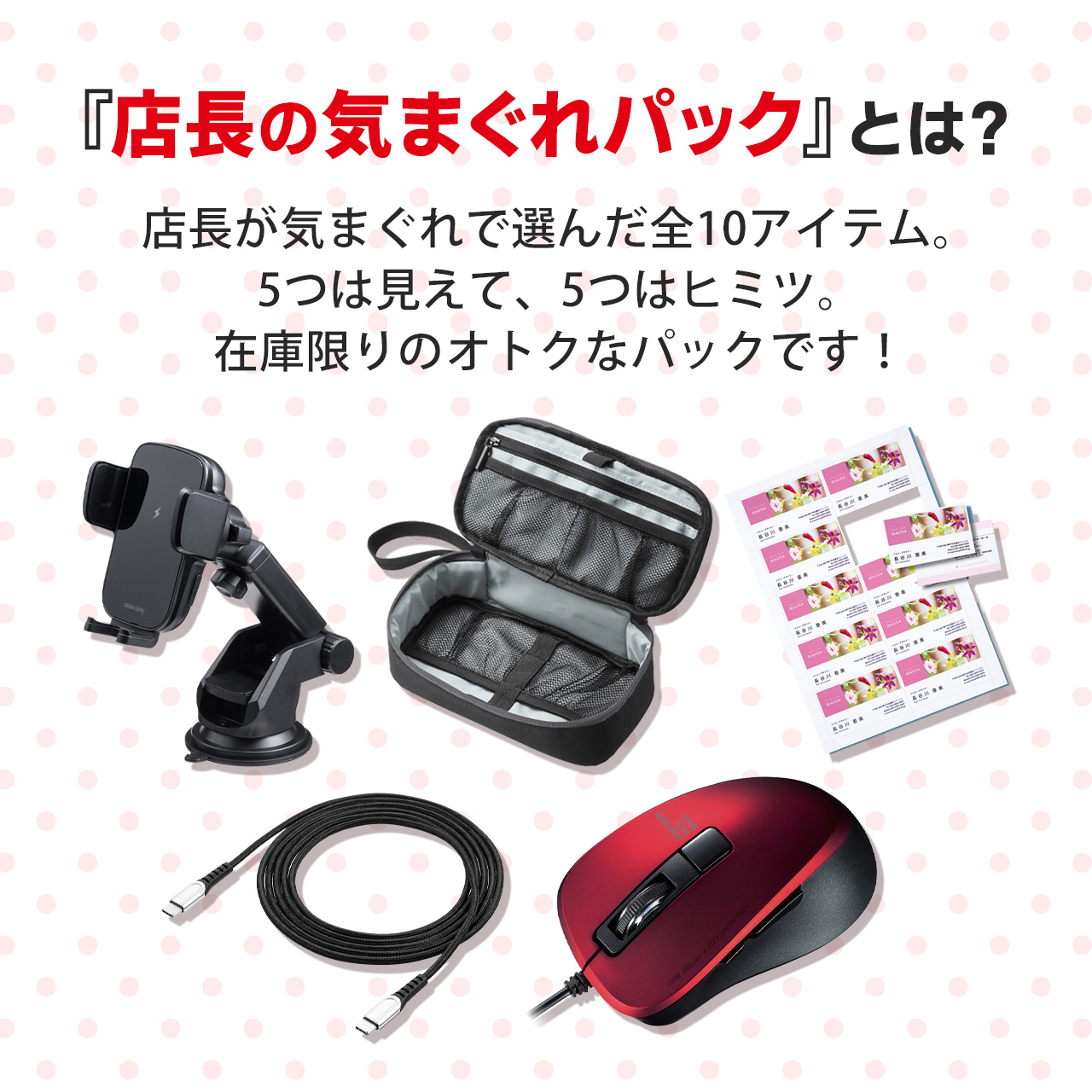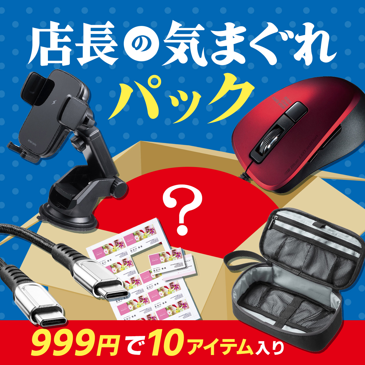 サンワダイレクトの店長が日頃の感謝を込めて作った【店長のきまぐれパック10点セット】を、イベント限定で税込み999円で販売します! 中身は車載ホルダー、マウス、ポーチ、ケーブルなど、テレワークや普段使いに便利なアイテムが盛りだくさん!さらに、開けてみてからのお楽しみのシークレットアイテムも入った、まさに“きまぐれ”でお得なセットです。【WEB限定商品】のサンワダイレクトの通信販売!