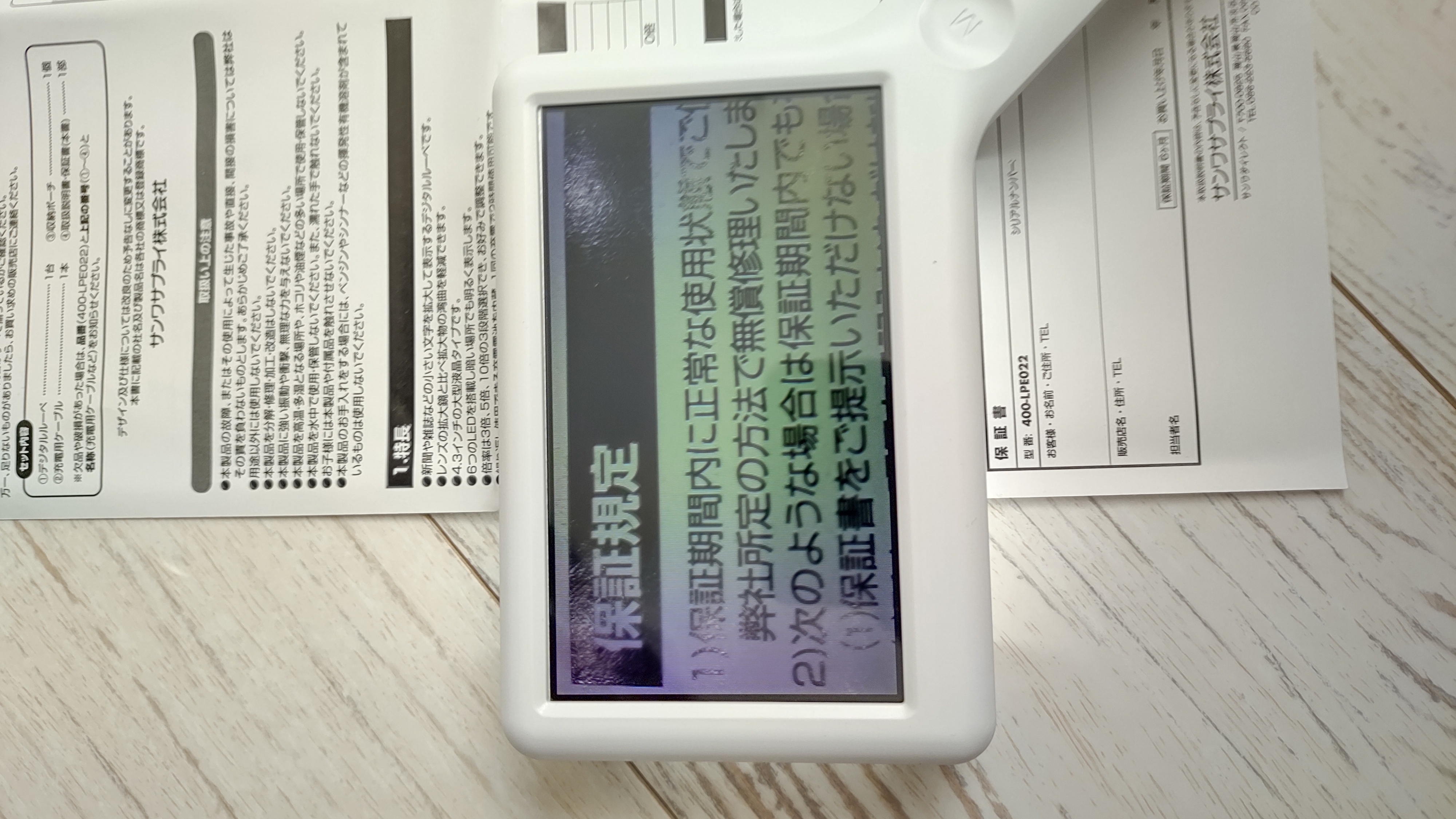 また、製品説明の地図を見ている画像をきちんと見ていればこちらも気が付けていたと思うが、本製品の取扱説明書の保証規定のように反射する材質の紙に細かい字でかかれているものを読もうとすると、LEDの反射で白飛びしてしまい、読みづらい
