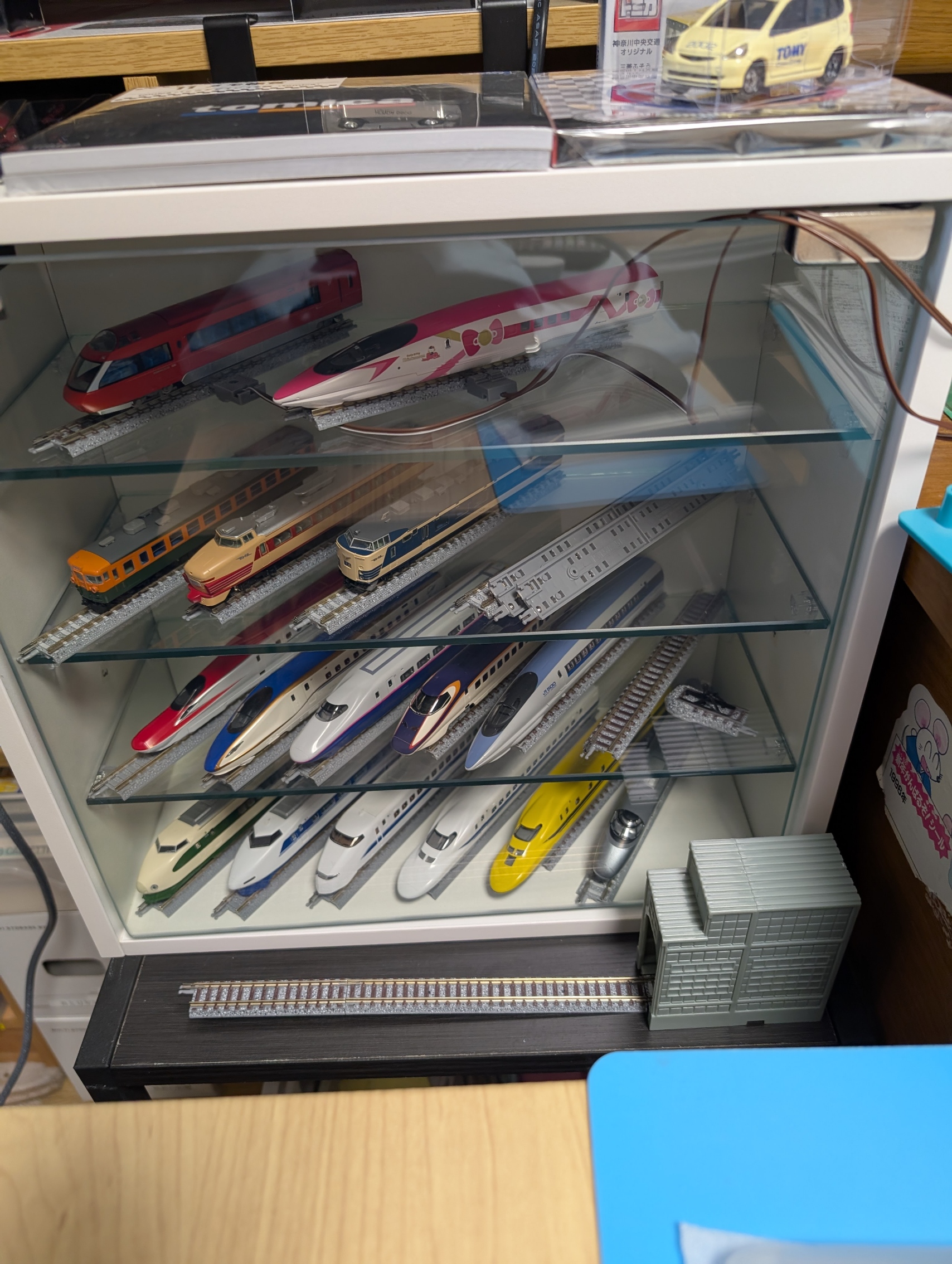 組み立て時ガラス面下の軸受けを入れるのにてこずりました。鉄道模型入れましたが斜めに並べることが出来ました。