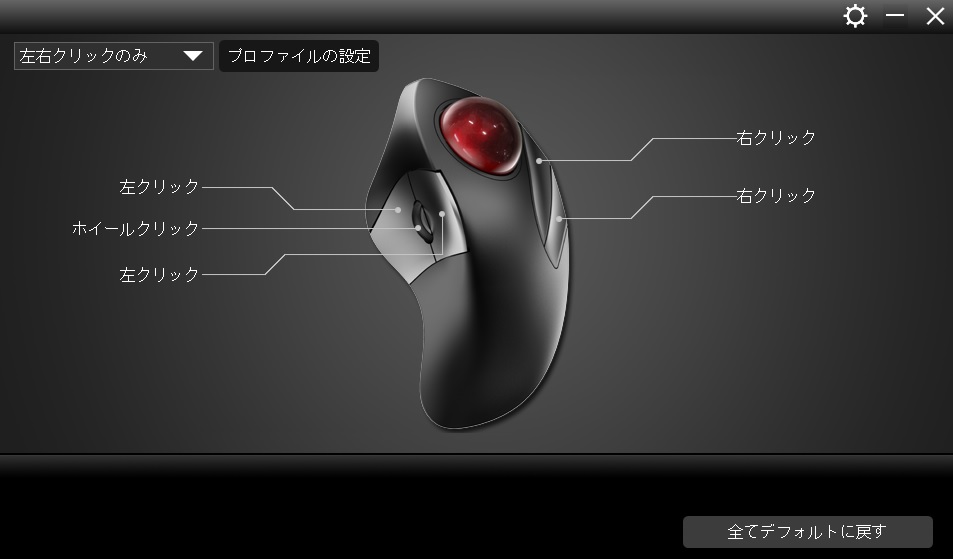 初期設定のままだと右クリック・左クリック・スクロールホイールがすべて親指での操作になってやりにくいので、添付画像のように進む・戻るボタンを右クリックに割り当て、右ボタンを左クリックに割り当てることで、トラックボールの左右が左クリックと右クリックに分かれるようにして使っている。
