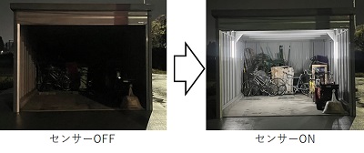 配線がない屋外の倉庫に設置しています。人感センサーで点灯するので、盗難予防や暗闇の鍵開け等とても便利です。