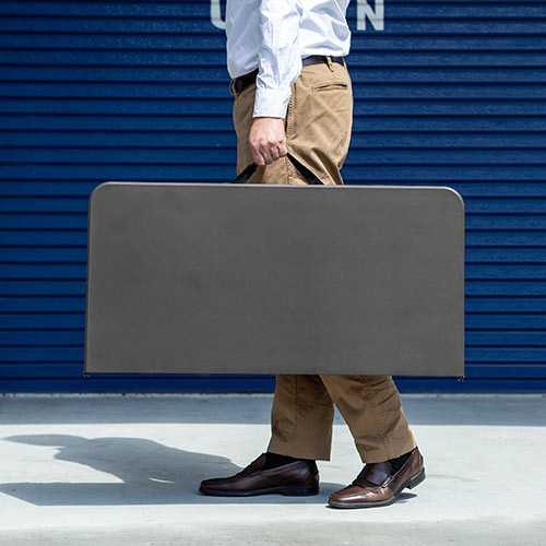 省スペースに収納できる折りたたみ式のテーブルです。使用しないときはコンパクトに折りたたむことができ、収納時に場所を取りません。ちょっとした簡易打ち合わせをはじめ、さまざまなシーンで便利にお使いいただけます。持ち運びに便利な取っ手付きのため、移動もスムーズです。