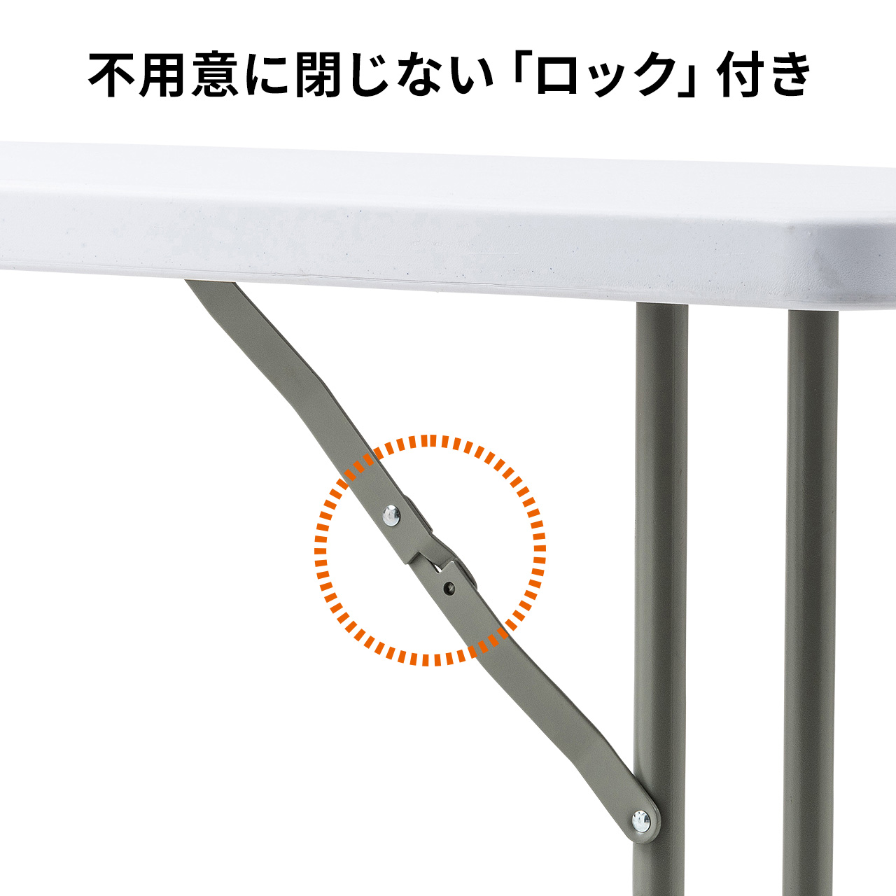 会議や研修、受付などのオフィスシーンはもちろん、屋外でのアウトドア用途にも対応しており、さまざまな場面で活躍します。横幅は180cmと十分な広さがあり、大人2人でもゆったりと使用できます。樹脂天板のため、木製天板の折りたたみテーブルと比べて軽量で、持ち運びもスムーズです。脚部にはロック機能が付いており、不意に脚が閉じる心配がありません。