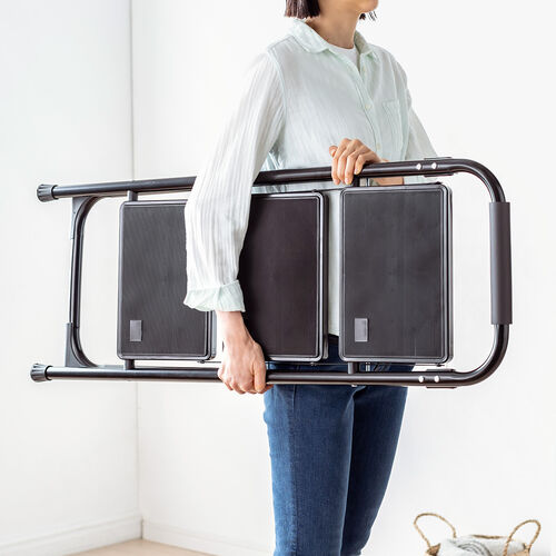 柔らかいクッション素材の持ち手付きで、不安定になりやすい上り下りもしっかり安定して行えます。高耐久設計のスチール&脚の滑り止めでグラつく心配もありません。