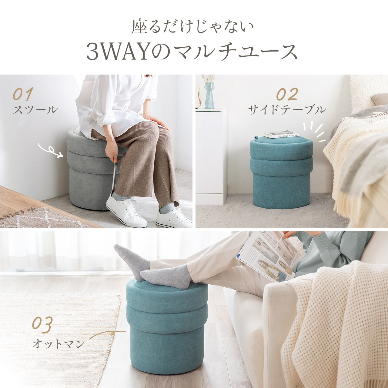 玄関や子供部屋ではスツールに、ちょっとした物を置いてサイドテーブルに、ソファ前では脚を伸ばすオットマンに。