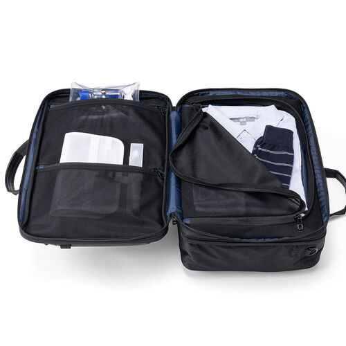 小物・衣類収納部はキャリーケースのように大きく開くフルオープン式で、メッシュの仕切りで荷崩れを防ぎます。ノートPC・タブレット収納部にはクッション入りのポケットを搭載しており、大切な機器をしっかり保護します。