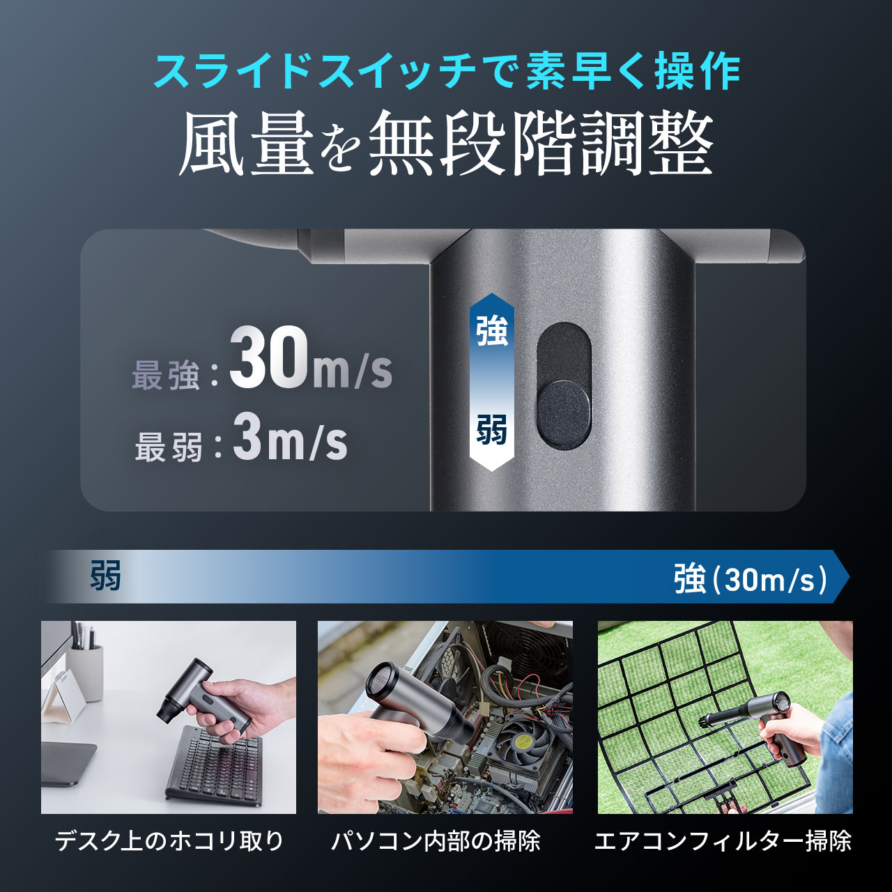 スライド式スイッチで風量を細かく調節可能。掃除対象に応じて最適な風力が選べます。