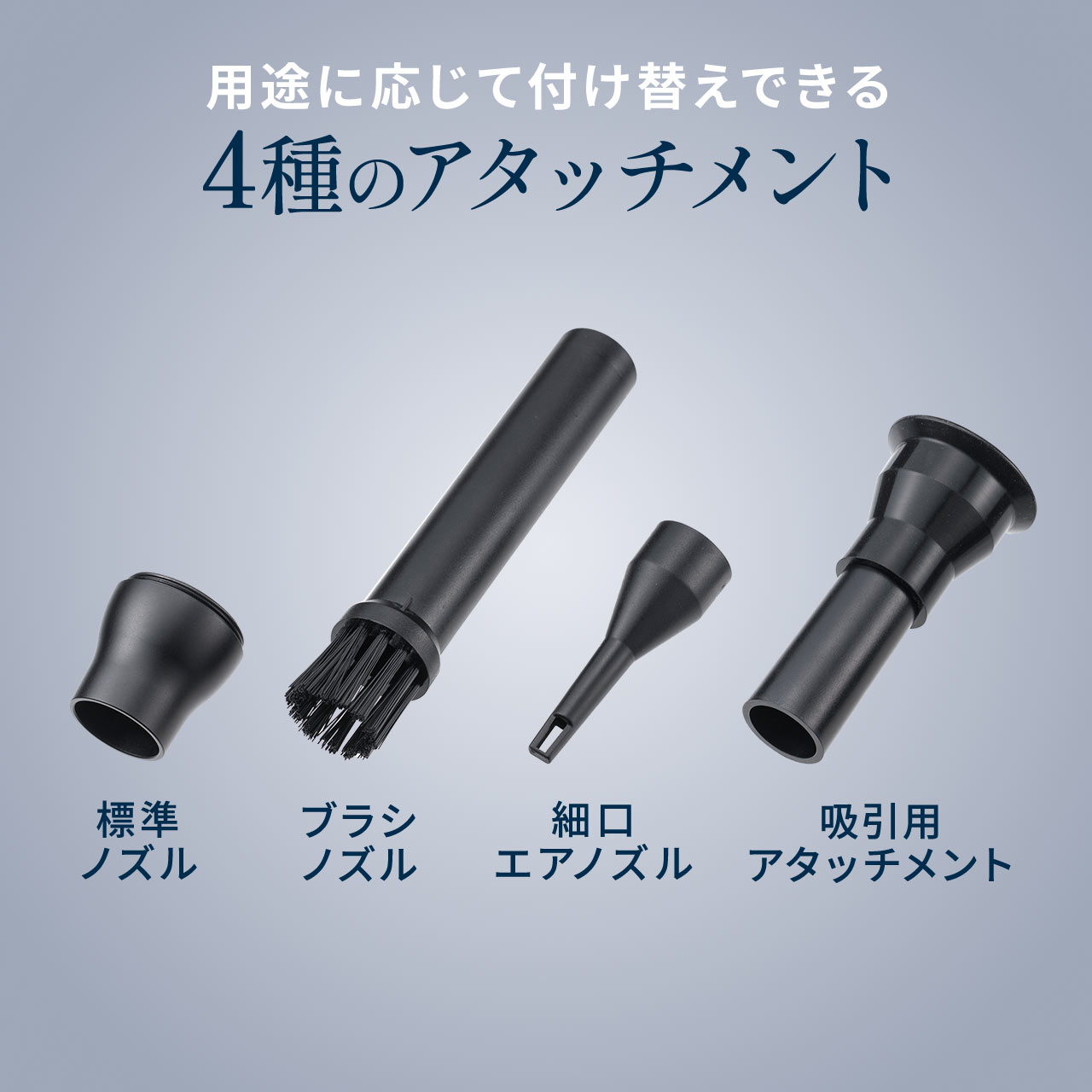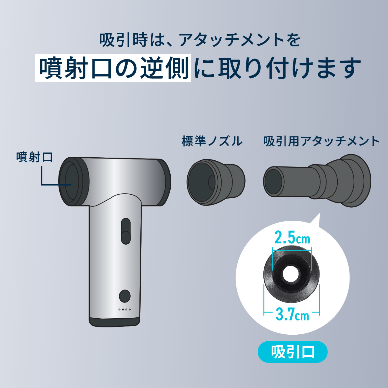 吹き出しだけでなく吸引も可能。アタッチメントを使えば、圧縮袋の空気抜きなどにも大活躍。