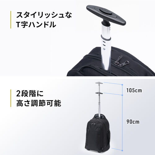 キャリーバーにはスタイリッシュなT字(1本軸)を採用。収納スペースを圧迫しにくく、軸1本分軽量なのも嬉しいポイント!2段階で高さ調節可能なため、体格やシーンに合わせて快適に使えます。