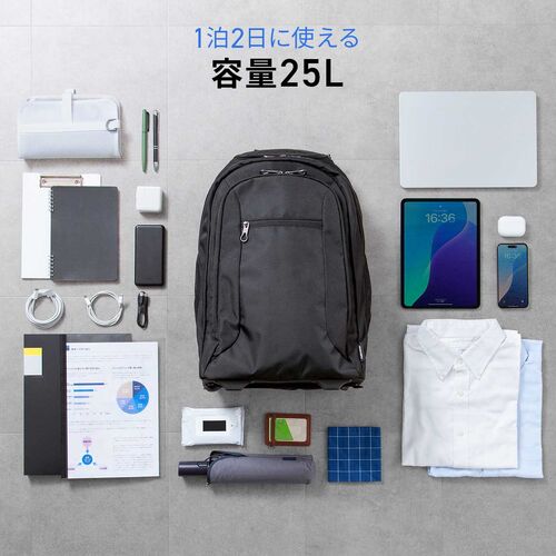 スリムながら25Lの大容量で、1〜2の出張/旅行に最適です。メインルームは大きく開いて荷物の出し入れが簡単。PCポケットや小物の整理に便利なポケットなど、豊富な収納を備えています。
