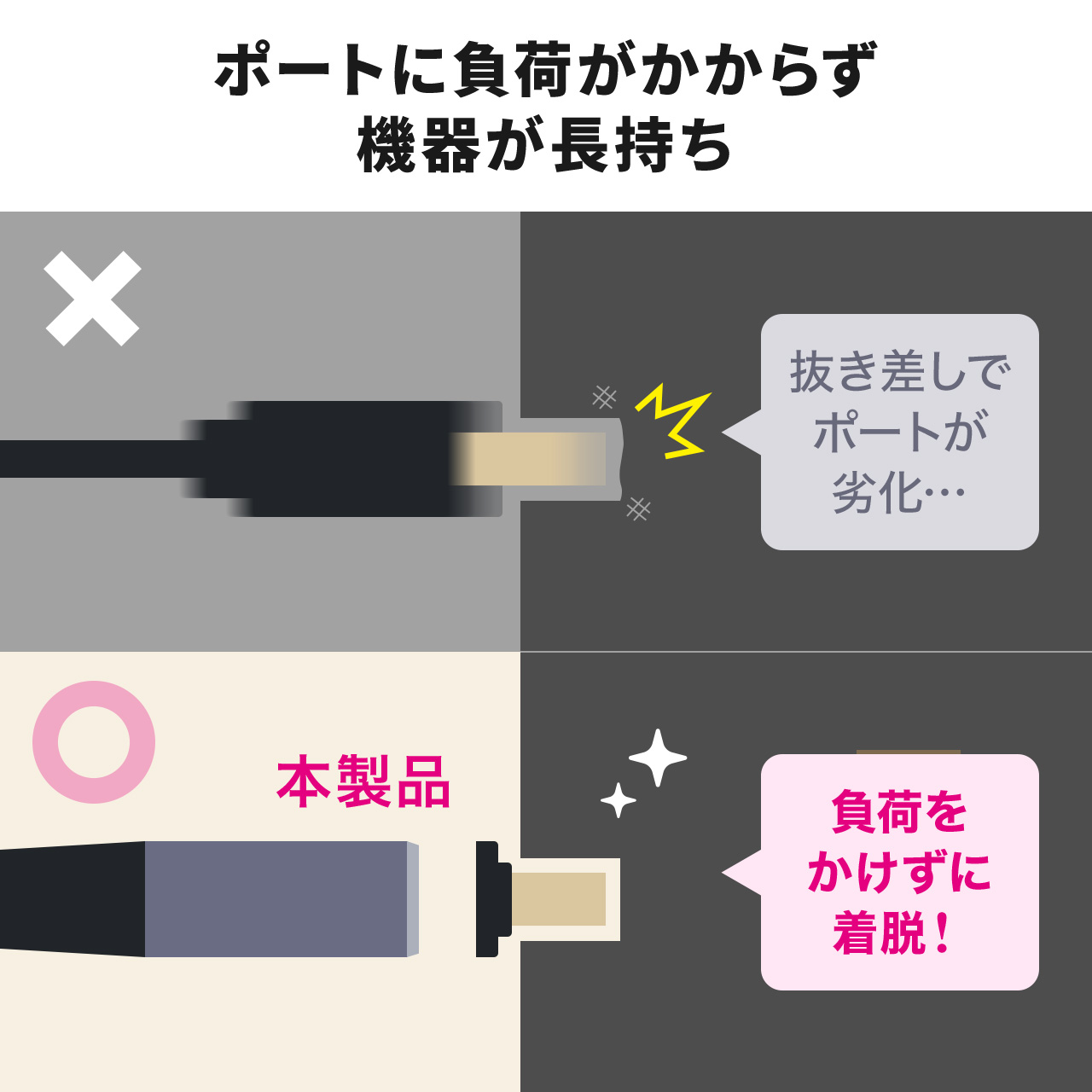 コネクタは挿しっぱなしOK。抜き差しによる摩耗を軽減。万が一ケーブルに力がかかっても、マグネットが外れて衝撃を逃がす設計。金メッキ端子+ナイロンメッシュで、信号劣化と断線も防ぎます。
