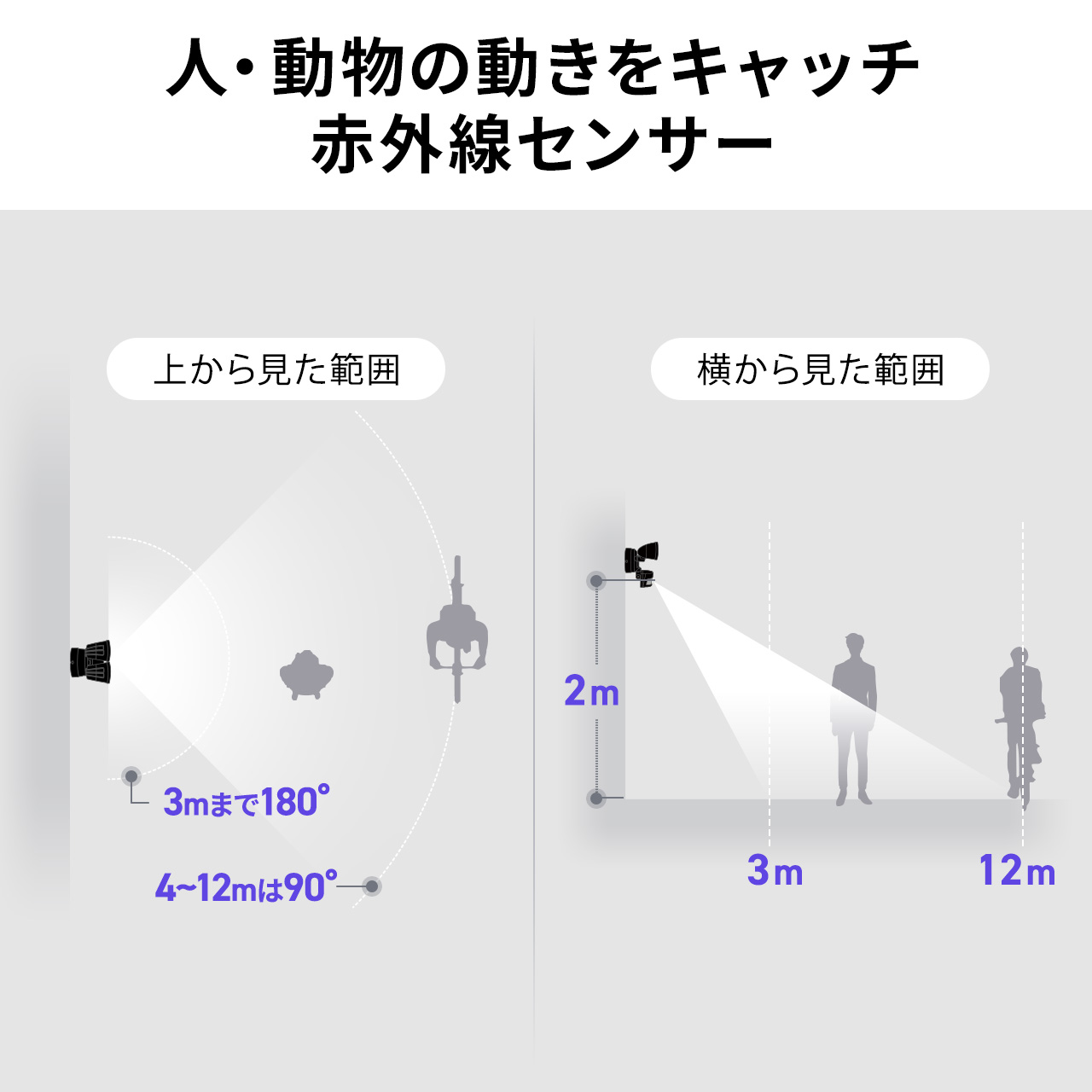 赤外線センサーが人や車の動きを検知すると即座に点灯&録画開始。威嚇と同時に証拠映像を残せる安心設計です。