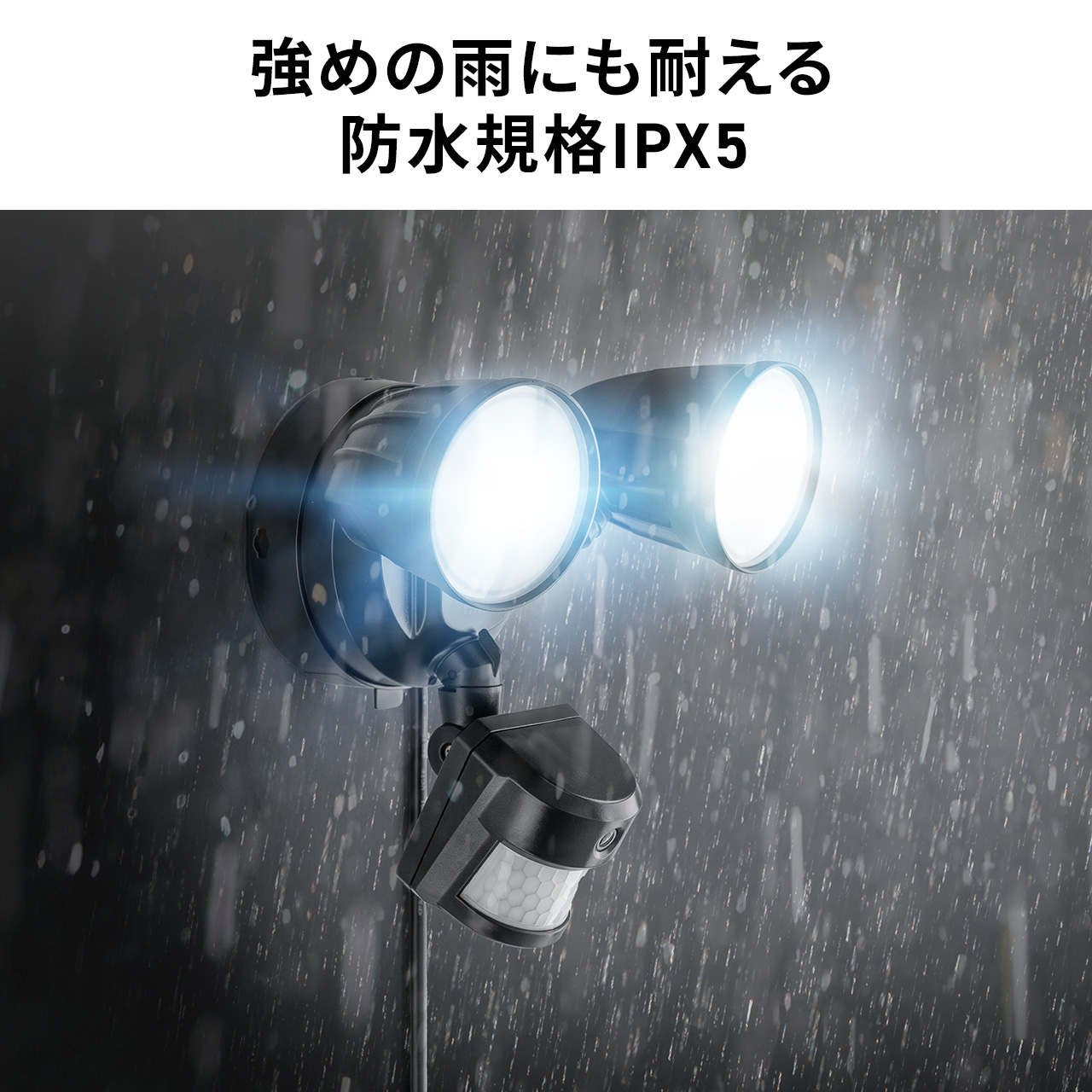 IPX5の防雨仕様で雨風に強く、玄関・勝手口・ガレージなど屋外設置に最適。コンセント式で安定した電源供給が可能です。