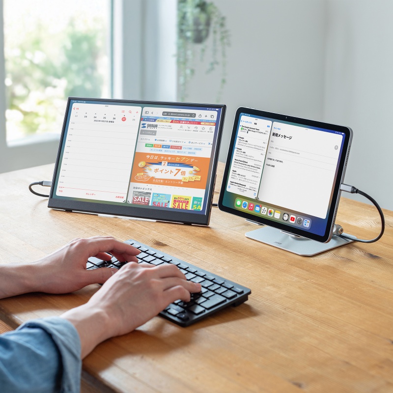 「情報は多いのに画面が小さい…」そんな場面、ありませんか?このモバイルモニターなら、ケーブル1本で簡単に画面を追加。ノートパソコンをタッチ操作で使えたり、スマホやタブレットの画面拡張・複製もできるので、作業の幅がぐっと広がります!