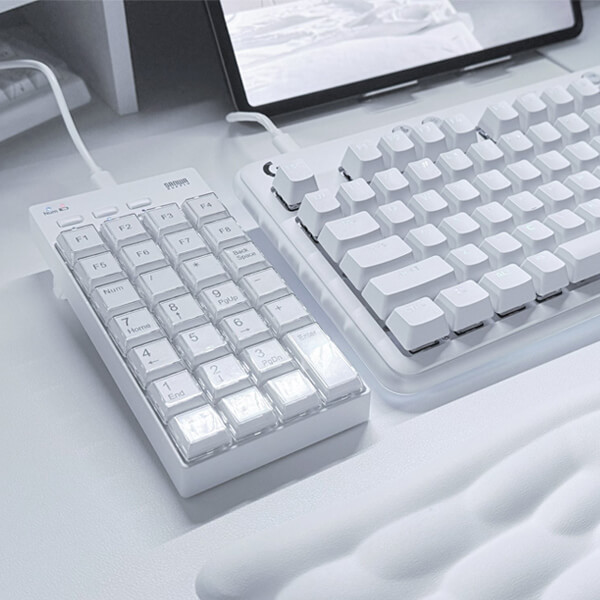 27キーにショートカットなどを割り当て可能なプログラマブルテンキー。3つのモードにそれぞれ割り当てて最大62キーに割り当てられる。ラベルを自作してオリジナルテンキーにカスタマイズ可能。有線接続。ホワイト。【WEB限定商品】